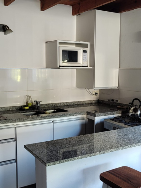 Chalet tipo cabaña para 5 personas. Planta baja y entrepiso. Cocina, comedor, living, playroom con 3 camas de 1 plaza y una cuna.Hab. matrimonial con sommier ALARMA MONITOREADA.Gas natural, Agua corriente, TV Chromecast estufas tiro balanceado en cada ambiente, Ventiladores de techo, Telefono, Microondas, Cafetera electrica, Desayunador, Plancha, ,, Deck con parrilla, juegos de jardin.