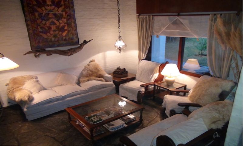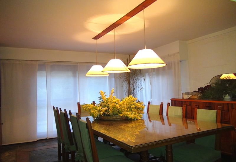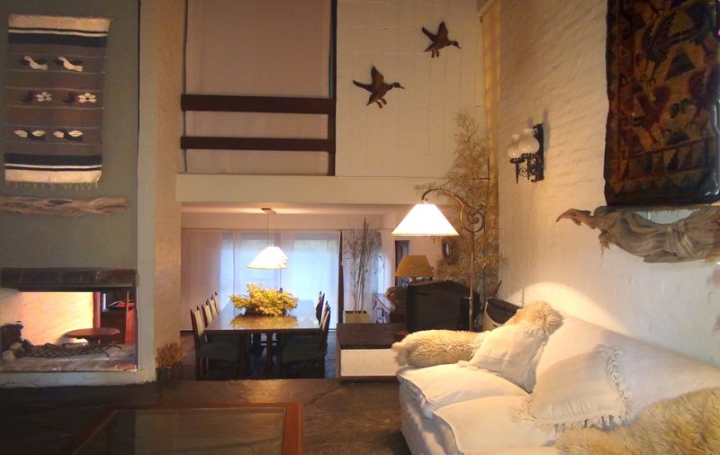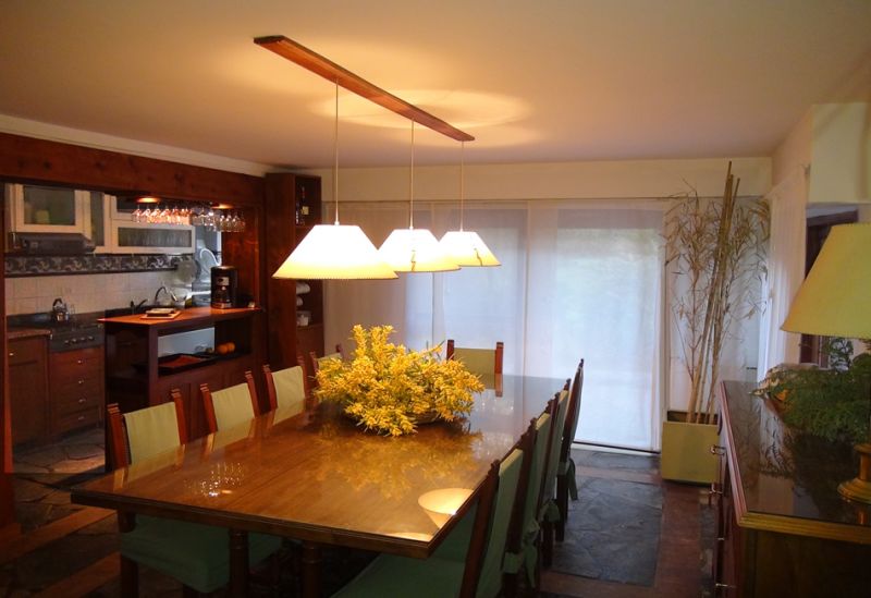 El living-comedor es amplio, con un gran ventanal al jardín y al parque, y otra ventana lateral al costado de la casa, lo hace muy luminoso, con una mesa importante de 1,20m x 2,50m de largo y 12 sillas. Hogar a leña en el living y confortables sillones, alrededor de una mesa baja, y un cómodo perchero en el ingreso.