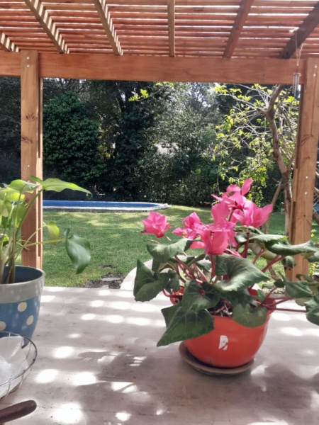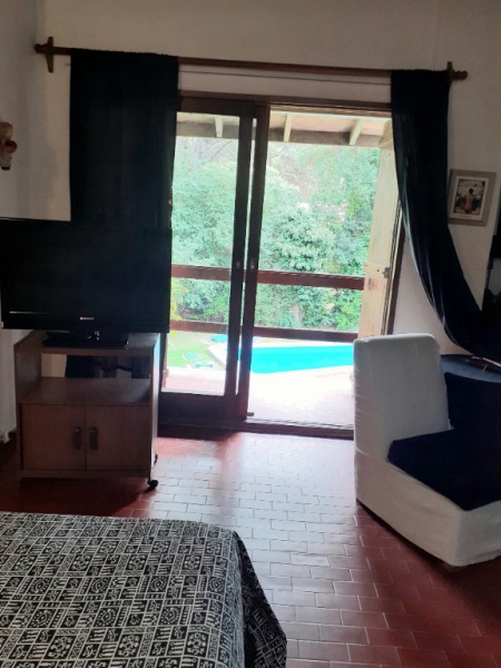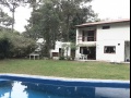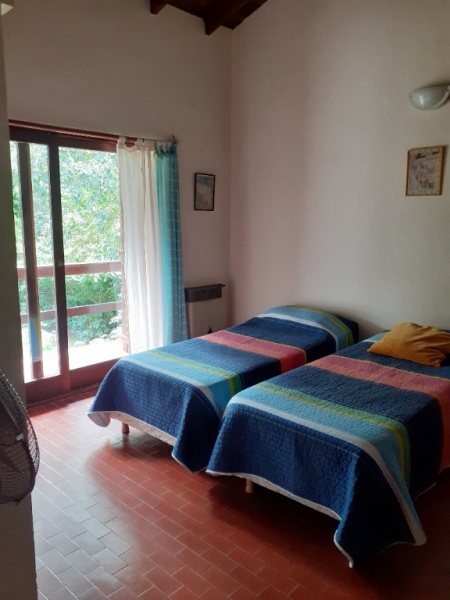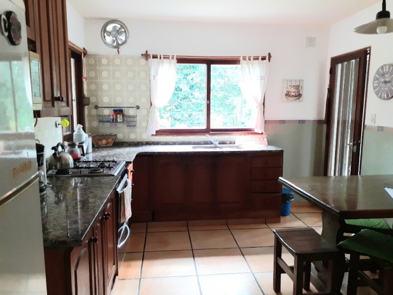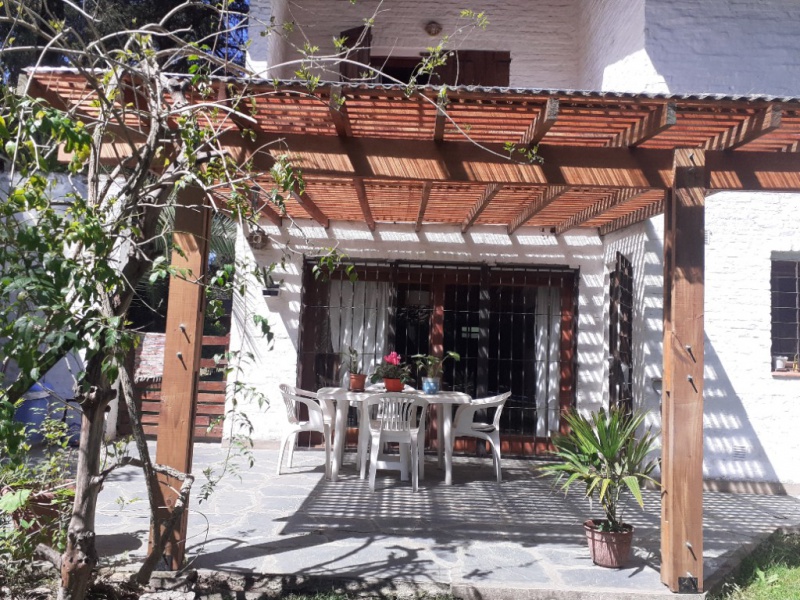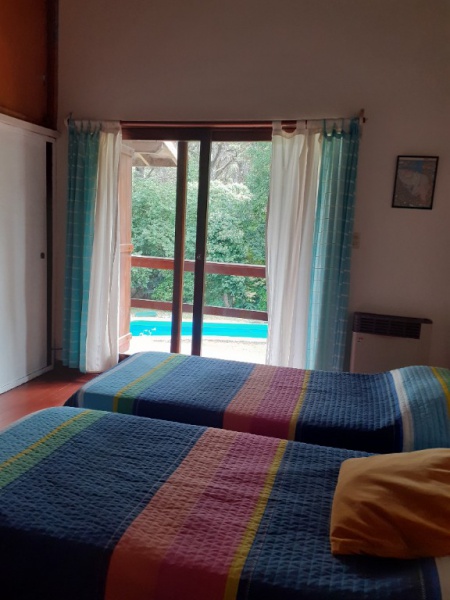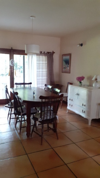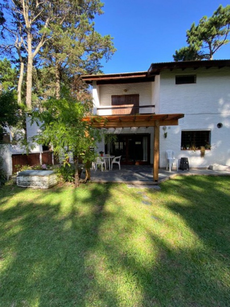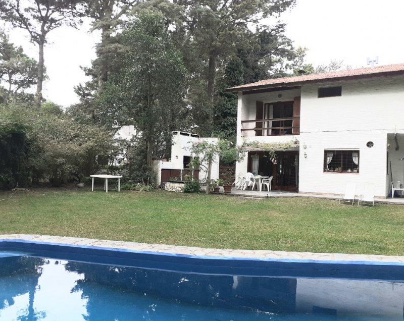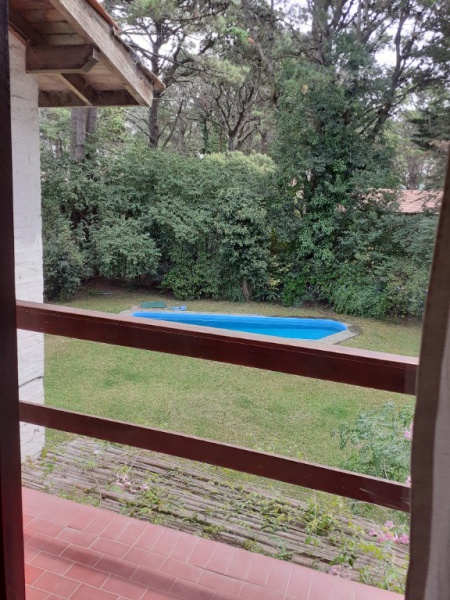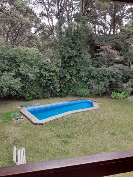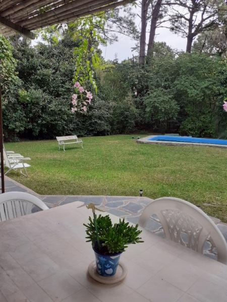 Chalet 7 pax, zona bosque Pinamar, muy luminoso, cerca del centro y de la playa. living - comedor en L generosas dimensiones, aprox. 50 mts. cdos , gran ventanal c/vista al parque 600 mts. cdos. totalmente parquizado con piscina de aprox. 10 x 4 mts, toilette, cocina , comedor diario con salida al parque .- servicio doméstico opcional. Lavadero con lavarropas automático y , termotanque. , y garage para dos autos y moto.- Escalera a planta alta de madera torneada.